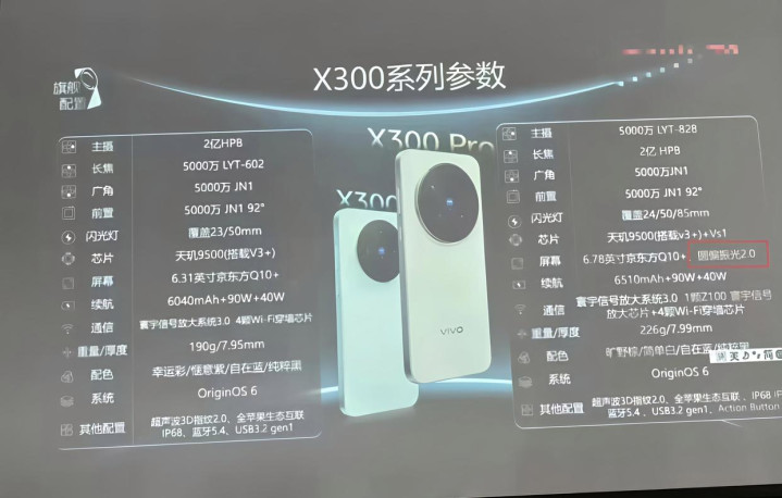 日前,网间晒出了疑似vivo X300系列已经进入vivo线下门店的真机照和配置信息。根据晒出的配置信息来看,基本与目前官方公布的该系列新机的配置信息一致。在外观方面,vivo X300系列标准版将采用6.31寸单挖孔直屏,分辨率为1.5K,支持120Hz自适应刷新率,屏幕材质为京东方Q10+,整机的机身厚度7.95mm,重量为190克。