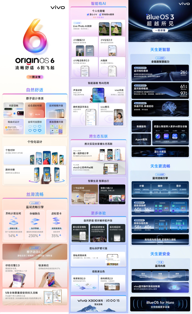 另外,日前, @vivo 正式发布了两款全新系统,并配文称,“#vivo全新系统OriginOS6# 与vivo自研蓝河操作系统 3 正式发布!#vivo全新系统OriginOS 6# 流畅舒适,6到飞起。流畅体验、视觉设计、AI 能力、跨端互联全面升级。#vivoX300系列#与#iQOO15# 首发搭载!vivo自研蓝河操作系统 3 全新发布,打造全链路智慧能力。基于轻量、可模块化部署的特点,将完整的 AI 技术方案便捷带入不同设备,超越边界,天生更智慧!即将发布的#vivo WATCH GT 2 #首发搭载 BlueOS 3,让智慧体验再升级!”